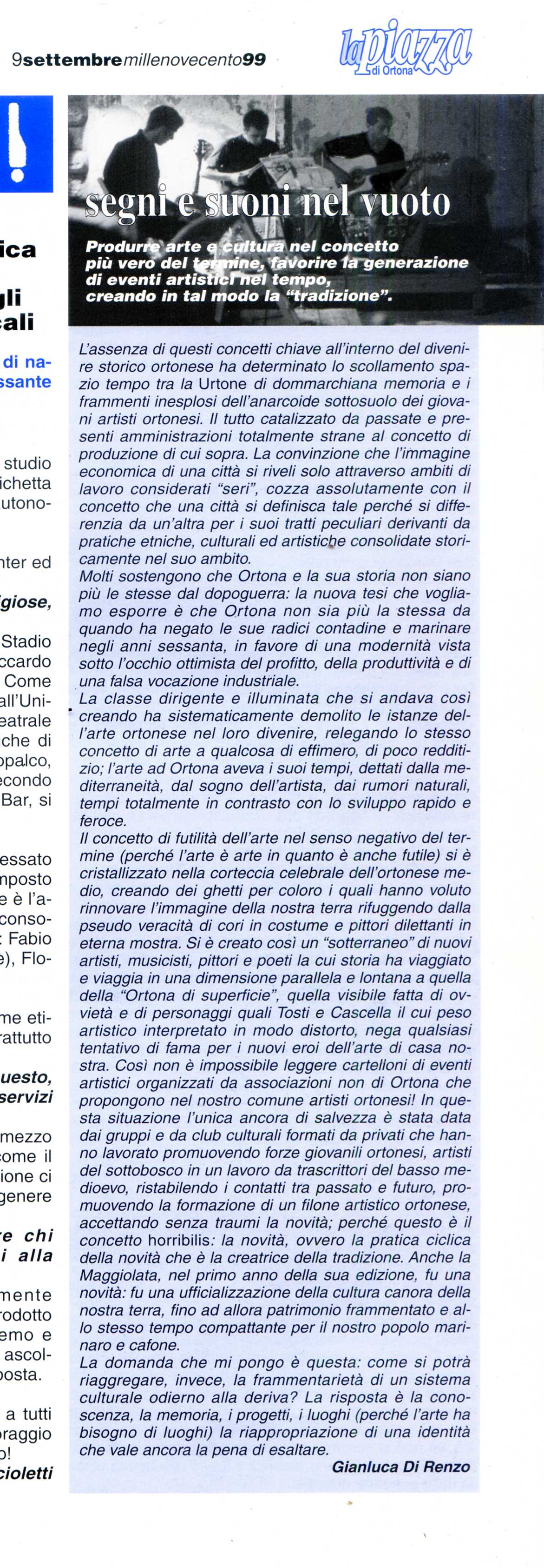 Inizio con il primo articoli che scrissi per “La Piazza” nel 1999. Il contenuto del testo avrebbe dovuto essere una sorta di manifesto di intenti per un gruppo di persone le quali uscivano dall’esperienza dell’Associazione Labirinto e dalla mia attività di volontariato, svolta negli anni novanta, attività che consisteva nella direzione di laboratori musicali e direzione di programmi Radio. Arrivavo anche dall’esperienza della fanzine “Rubbish“, una sorta di foglio di informazione musicale non autorizzato che aveva riscosso notevole successo, negli anni ottanta, tra gli appassionati di heavy metal italiani ed esteri. E’ stupefacente notare come, tutte le criticità e gli stati di fatto, messi in evidenza da me nella scrittura di quell’articolo, possano essere riferiti alla situazione attuale, senza il pericolo di risultare obsoleti e fuori dal tempo. La situazione, ad Ortona, non è cambiata affatto o, paradossalmente, è cambiata in modo così radicale, da far risultare la mia visione totalmente inadeguata non per mancanza di contenuti ma per mancanza di interlocutori. Queste pubblicazioni hanno lo scopo precipuo di praticare un “lavaggio del cervello” profondo il quale consenta al sottoscritto, di osservare il presente con un occhio nuovo, scevro da qualsiasi rimpianto.